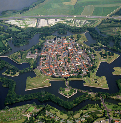 Naarden is een indrukwekkend voorbeeld van een stervormig fort, compleet met versterkte wallen en een gracht, waaraan historische gebouwen en monumenten zoals de Sint Vituskerk te vinden zijn. Deze grote gotische basiliek stamt uit de 14e en 15e eeuw en is een van de oudste overgebleven kerken in Nederland.